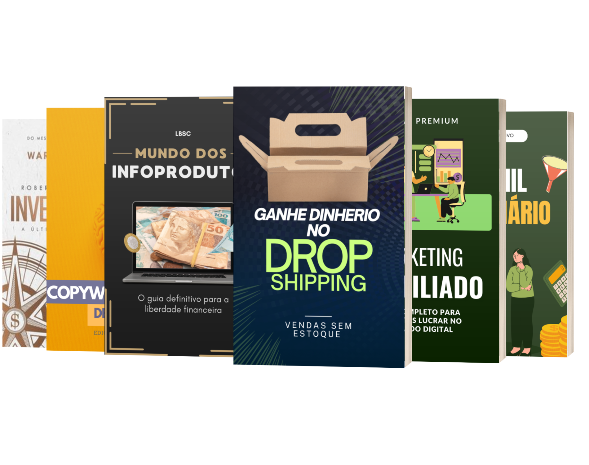 Por quase a metade do preço original, você vai receber a Coleção Completa, um arsenal de conhecimento com 4 guias essenciais para o seu negócio: Dropshipping, Marketing de Afiliados, Funil Milionário e Infoprodutos. E, como um presente especial, você ainda leva 2 e-books bônus exclusivos, de Copywriting e Investimentos.